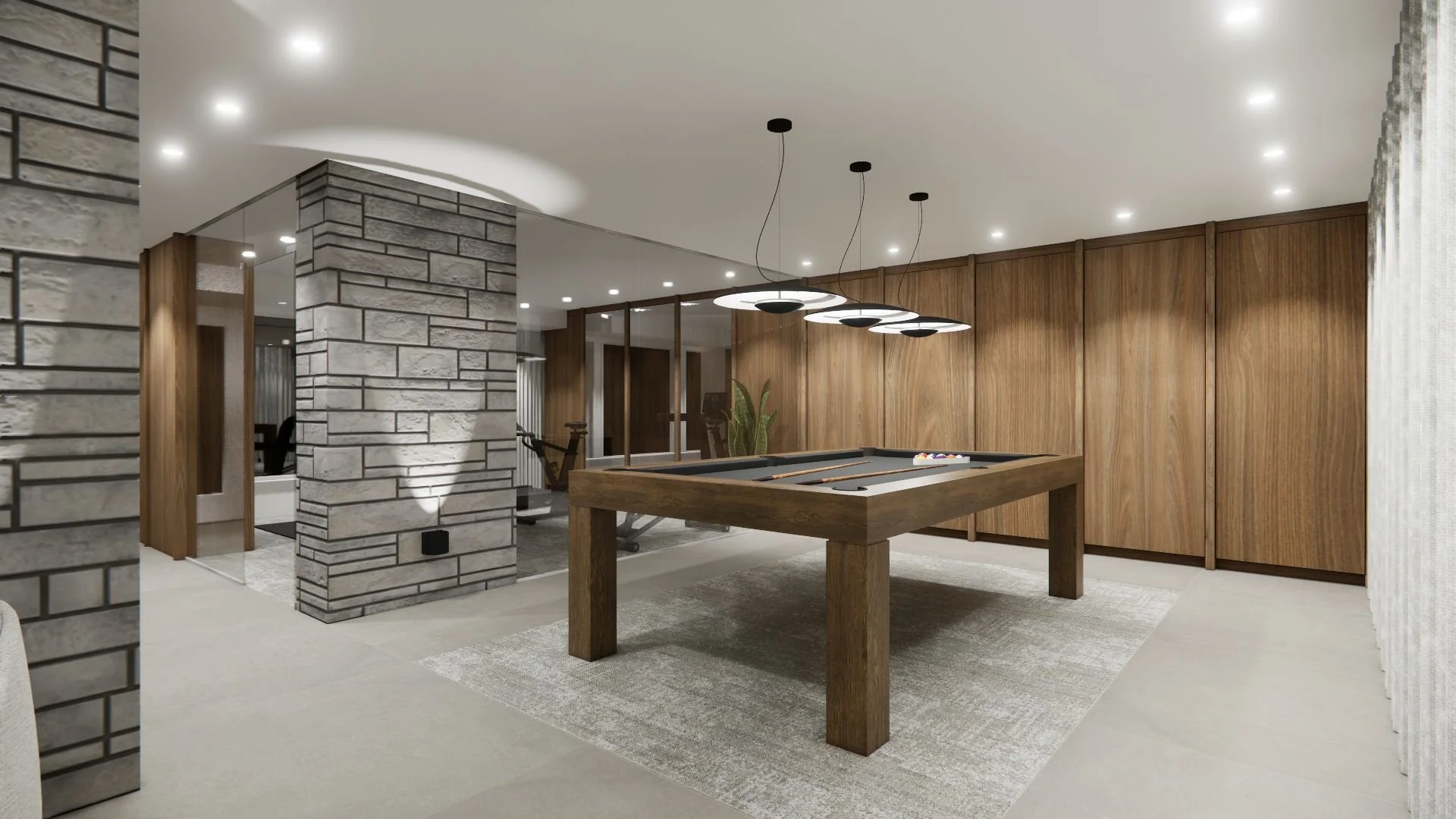 L’espace gym vitré ajoute une dimension fonctionnelle sans nuire à la fluidité visuelle. L’ouverture entre les zones permet de profiter d’un environnement polyvalent et évolutif, où chaque détail a été pensé pour conjuguer style, confort et praticité.