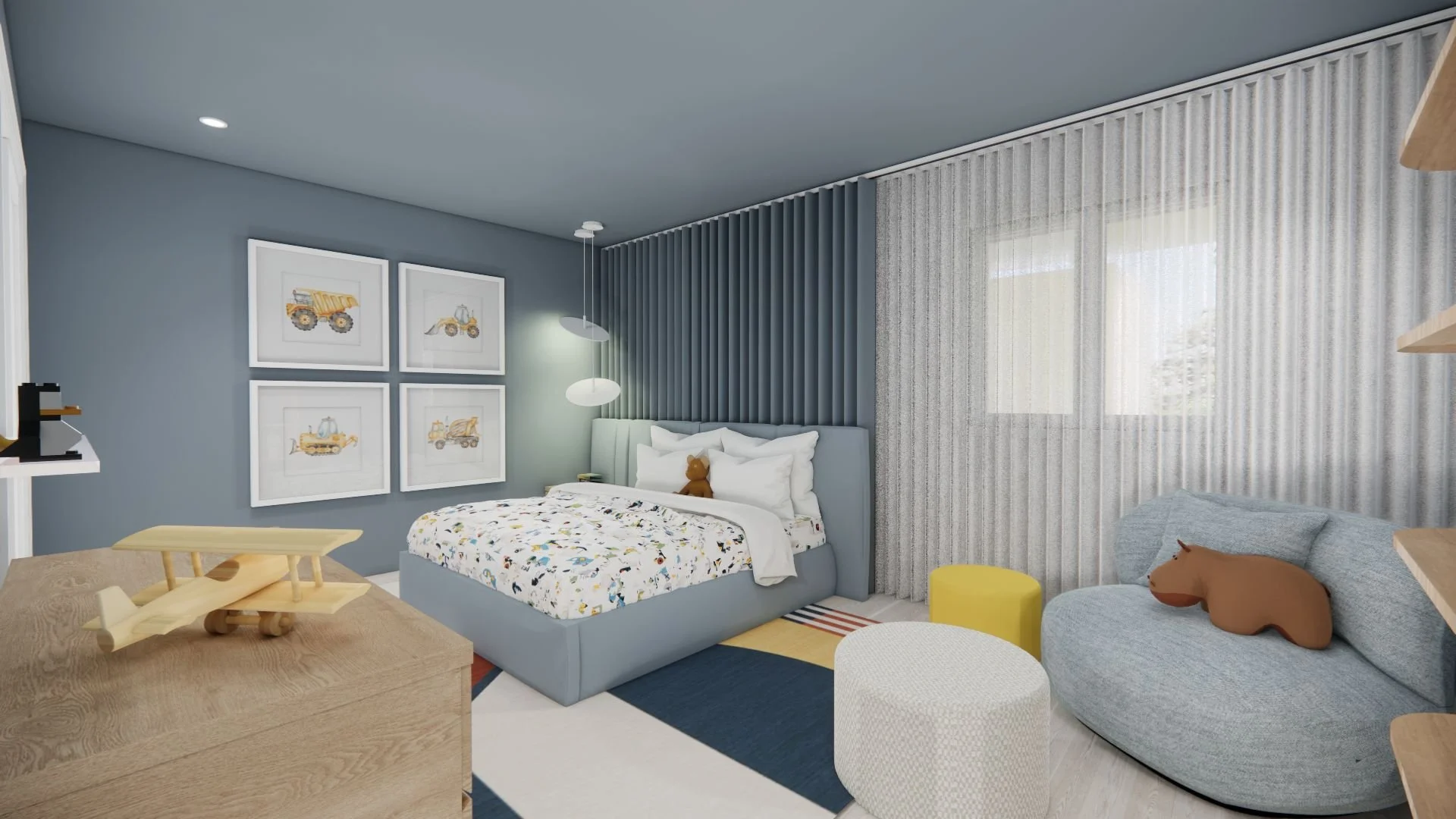 Cette chambre a été imaginée pour accompagner un jeune garçon à travers les différentes étapes de sa croissance. Les couleurs vives et les détails ludiques créent un univers joyeux, à l’image de l’enfance. La sélection soignée des matériaux et du mobilier assure quant à elle une belle durabilité, tandis que les bases neutres et intemporelles, ponctuées de touches colorées modulables, permettront à la pièce d’évoluer aisément au fil des années, selon ses goûts et ses besoins.