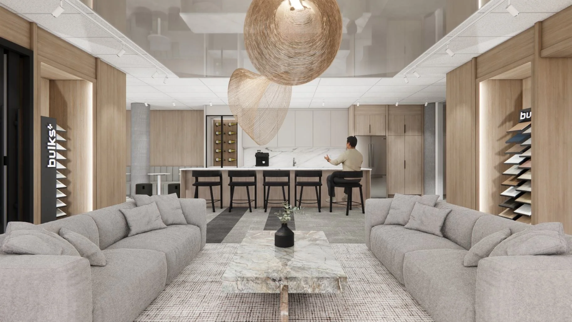 La cuisine se démarque grâce à son grand îlot qui structure tout l’espace. Il offre aux employés un endroit confortable pour leurs repas et leurs pauses, tout en permettant aux clients d’observer de près la qualité des installations. Chaque finition y reflète le soin et le professionnalisme apportés à leur futur projet.