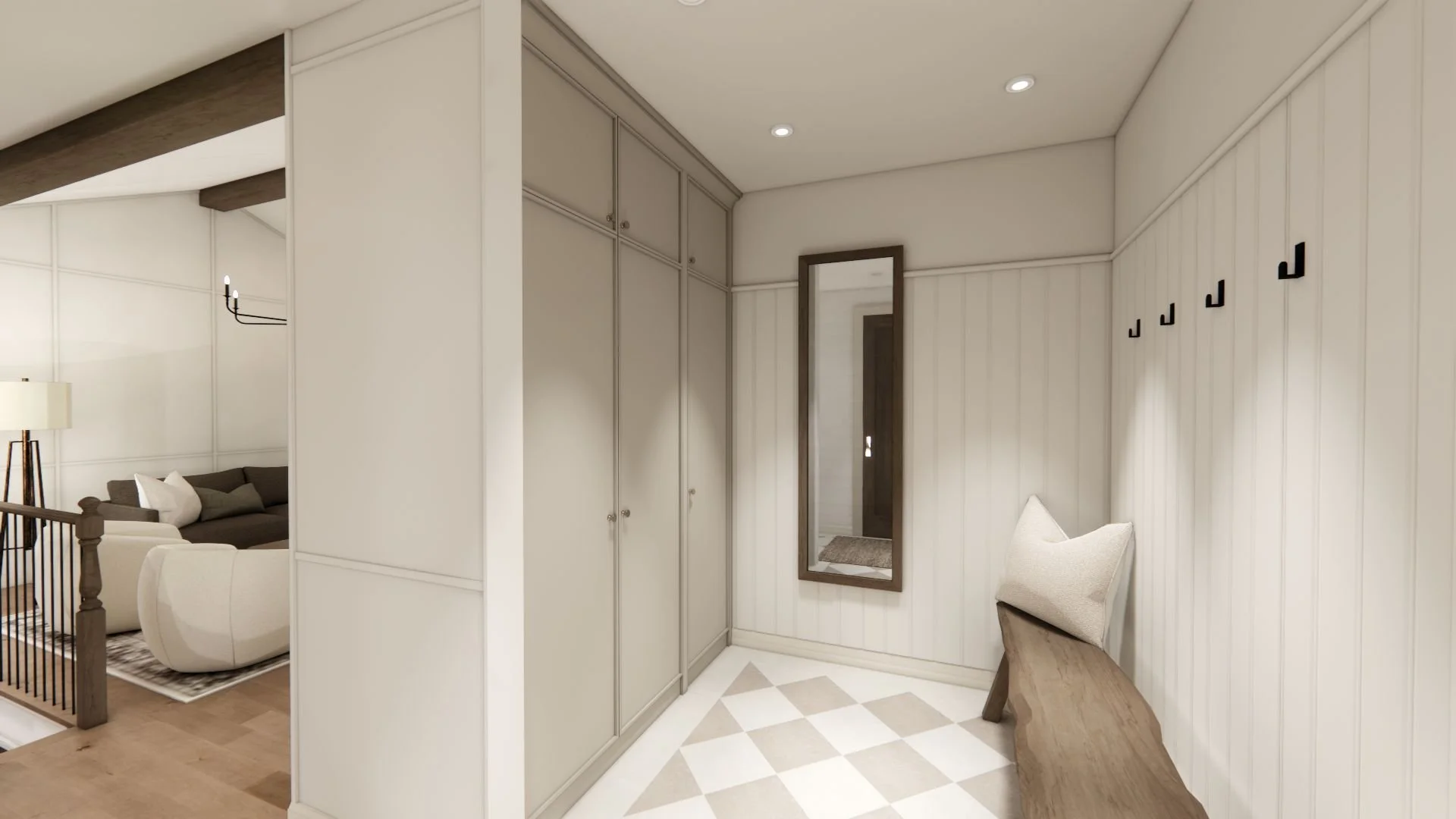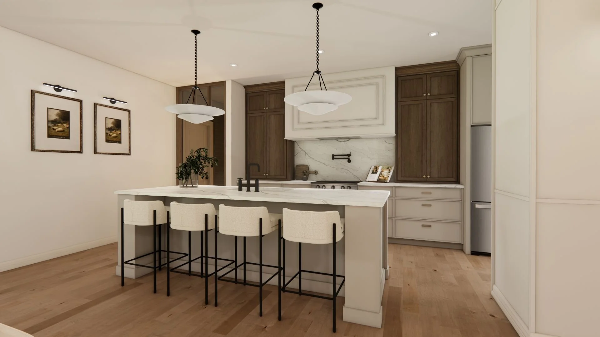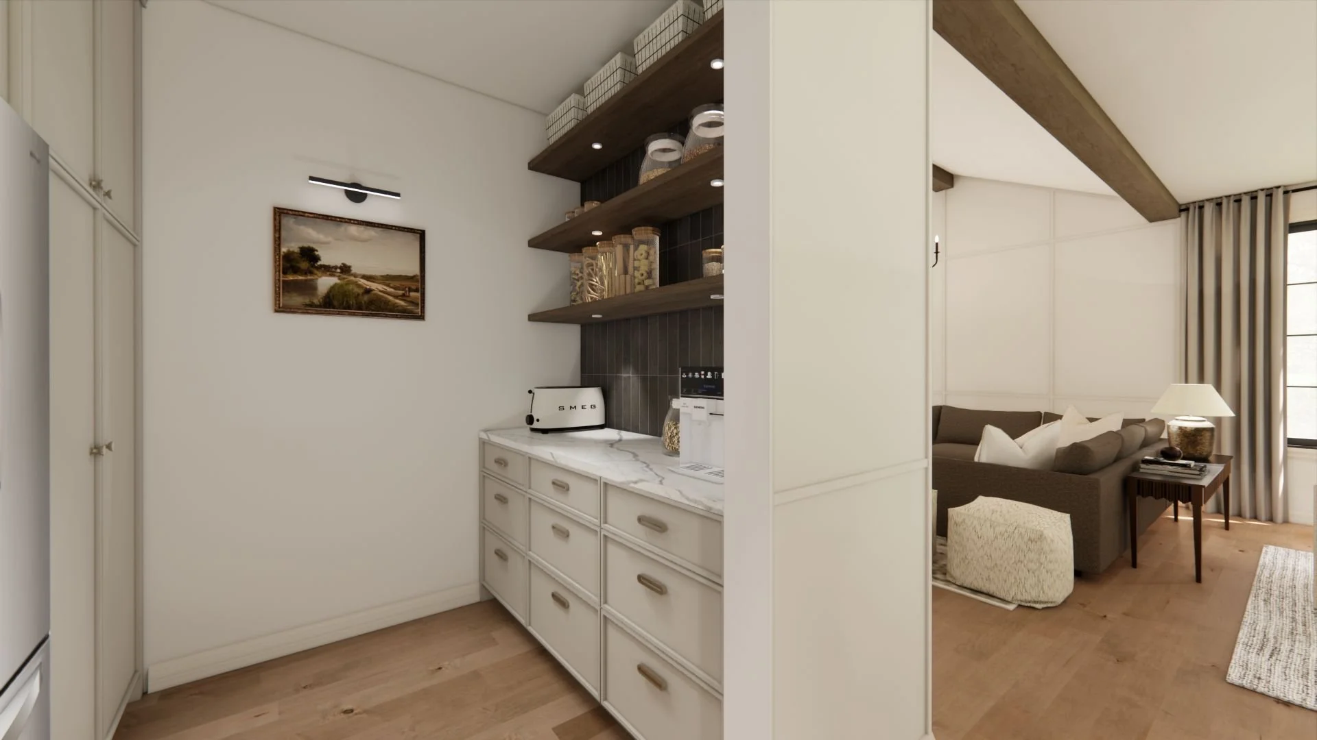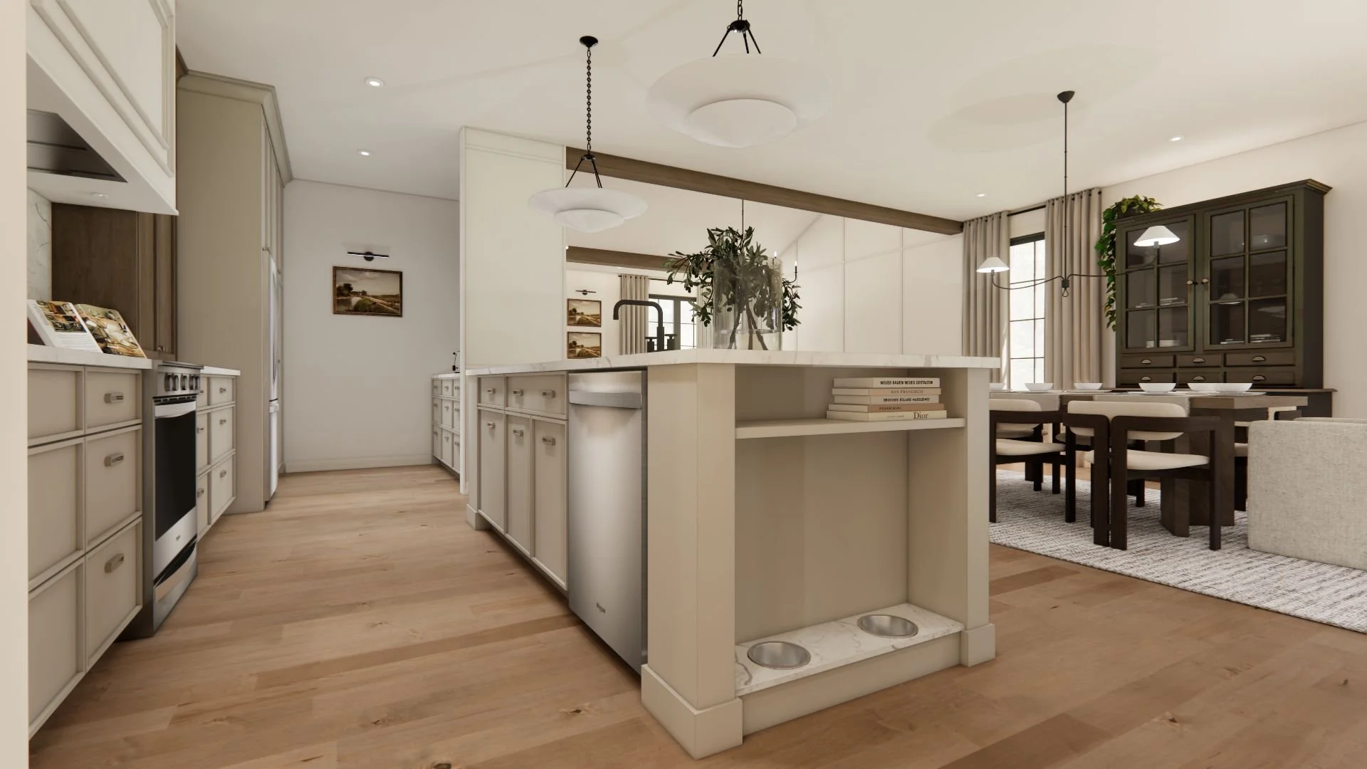 Dans la cuisine, chaque détail a été soigneusement réfléchi, notamment le pantry dissimulé pour optimiser la fonctionnalité sans nuire à l’harmonie de l’espace. Même Léon, le chien de la famille, a son propre coin intégré à l’îlot, afin que chacun trouve sa place au cœur de la maison.