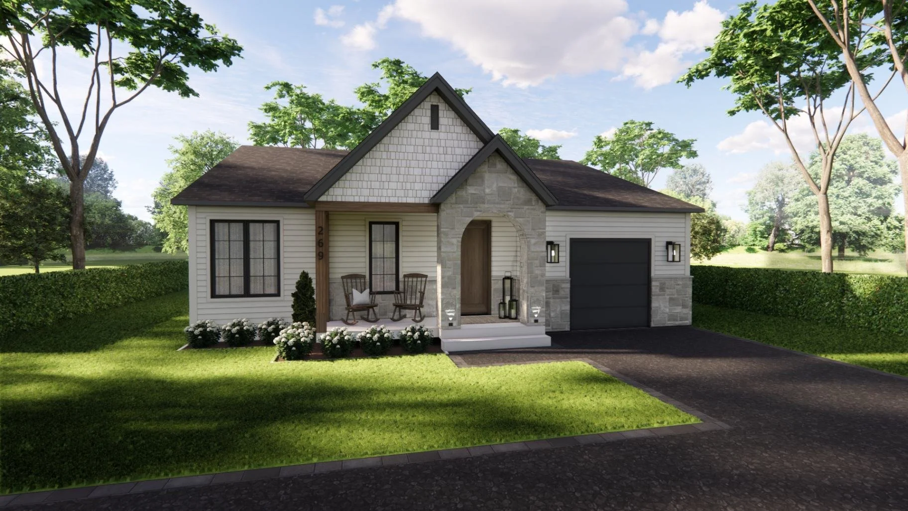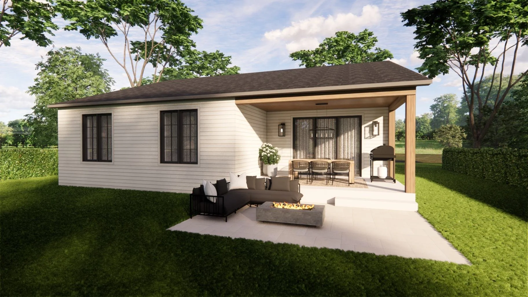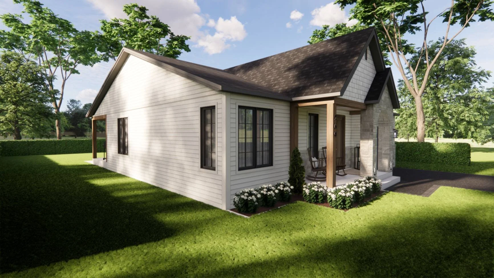 Avec son revêtement beige et son arche en pierre, la maison dégage une allure à la fois naturelle et accueillante. À l’avant, une petite terrasse aménagée de deux chaises invite aux cafés du matin. À l’arrière, une grande terrasse couverte permet de recevoir confortablement et de profiter pleinement des beaux jours.