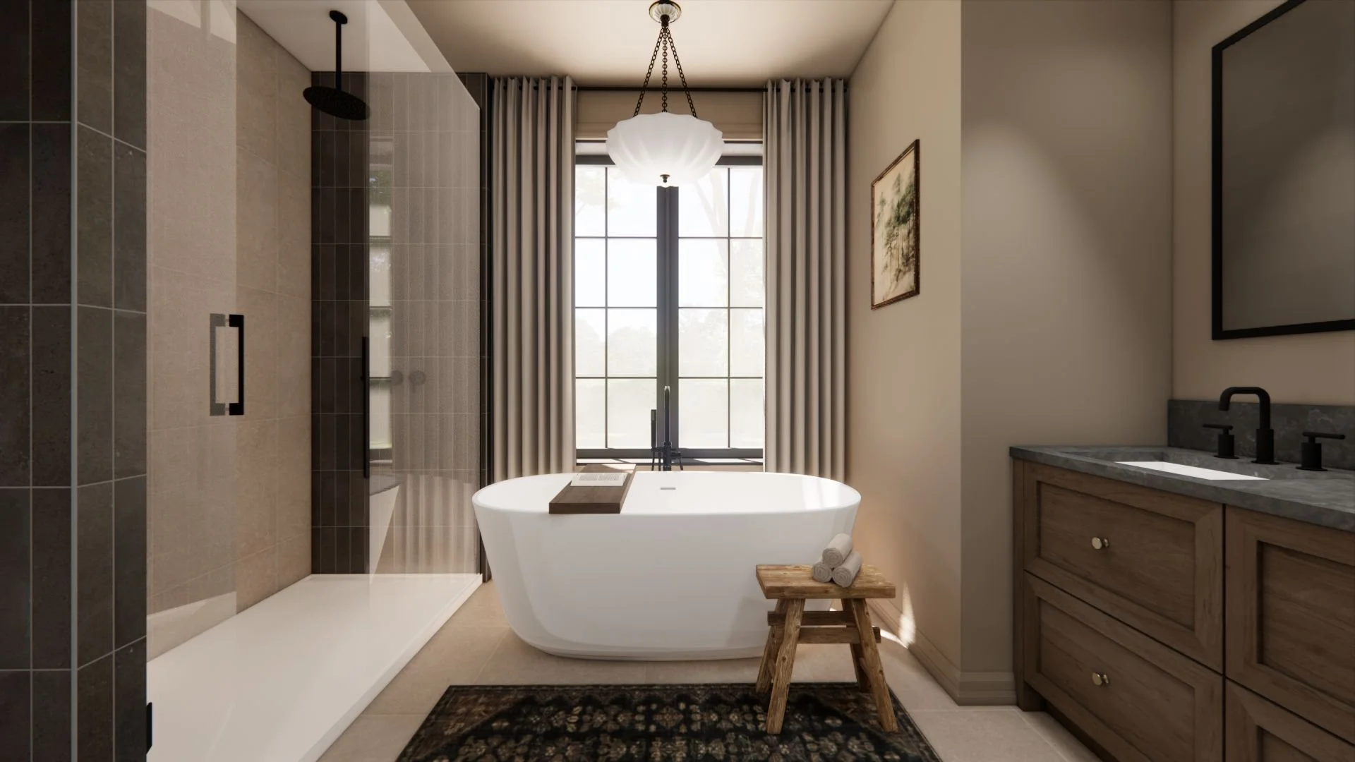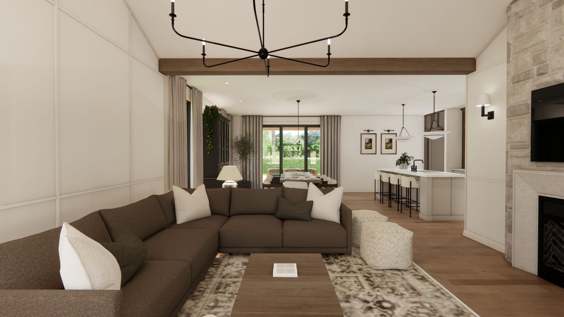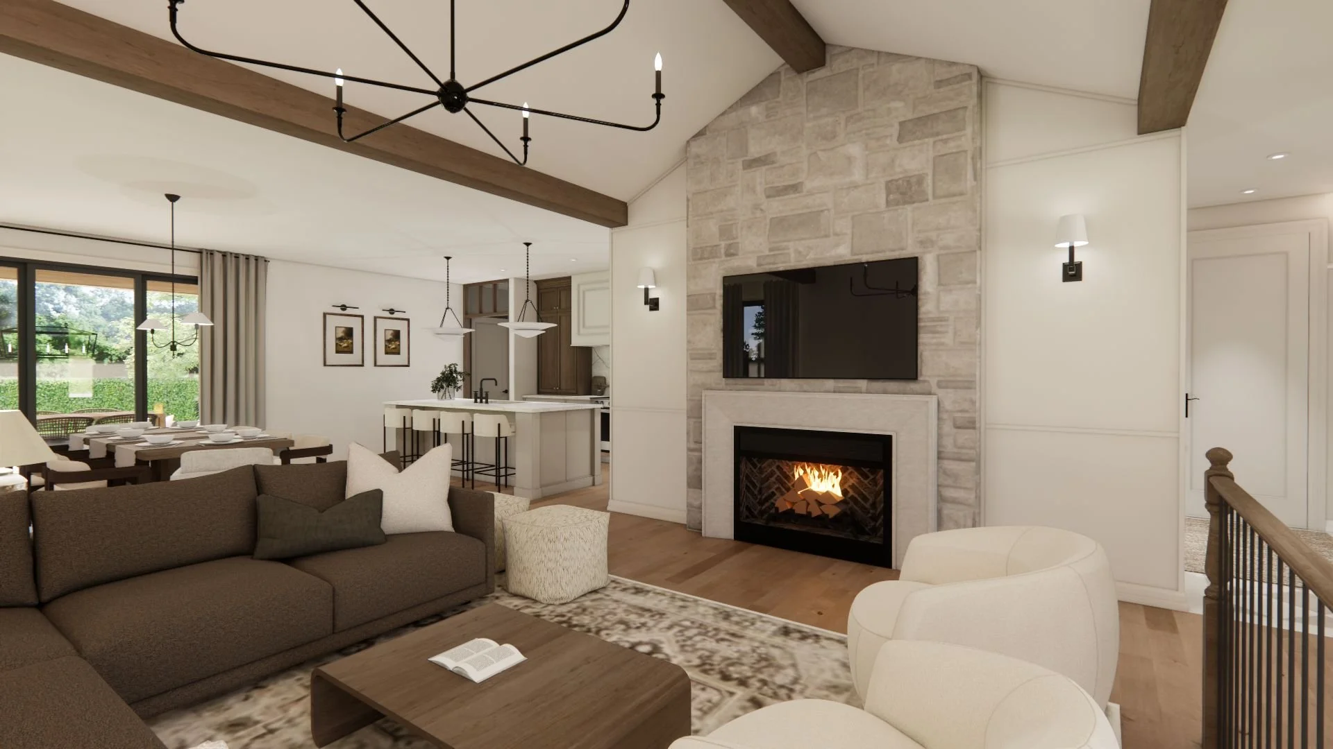 Le salon, avec son plafond cathédrale et son foyer de pierre visible depuis la salle à manger, constitue le cœur de la maison. Les matériaux et les teintes naturelles comme le bois, la pierre, le brun et le beige s’unissent pour créer un décor à la fois simple et enveloppant.