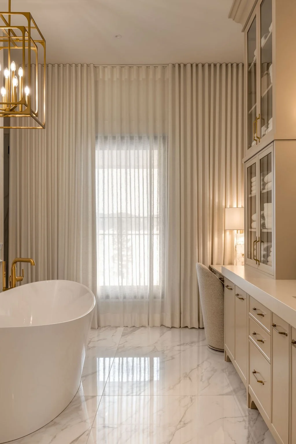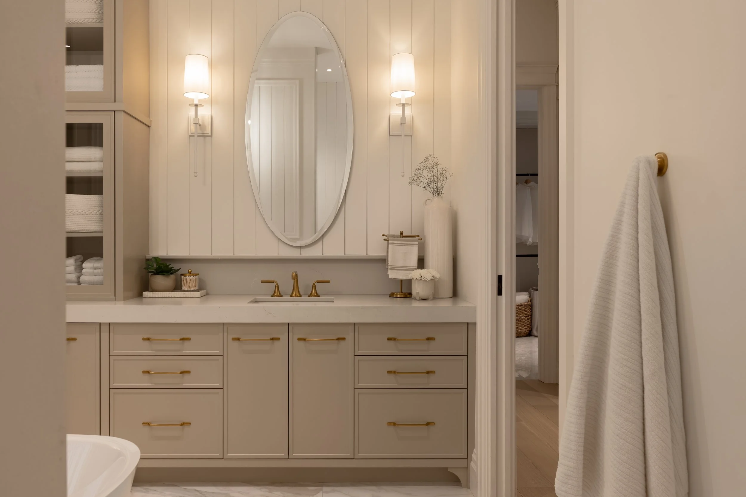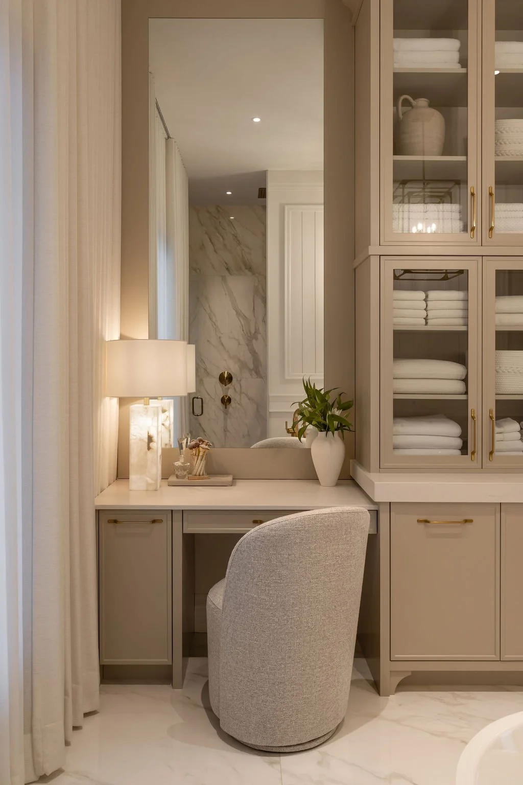 Classique sans être rigide, raffinée sans jamais être froide, cette salle de bain a été pensée comme un véritable espace de bien-être. La maquilleuse, soigneusement intégrée, offre un lieu idéal pour se préparer dans une atmosphère calme et lumineuse. La grande douche et le bain invitent à la détente, tandis que l’espace toilette, volontairement isolé, assure confort et intimité. Un lieu équilibré, où chaque fonction trouve naturellement sa place, dans une harmonie à la fois sobre et enveloppante.