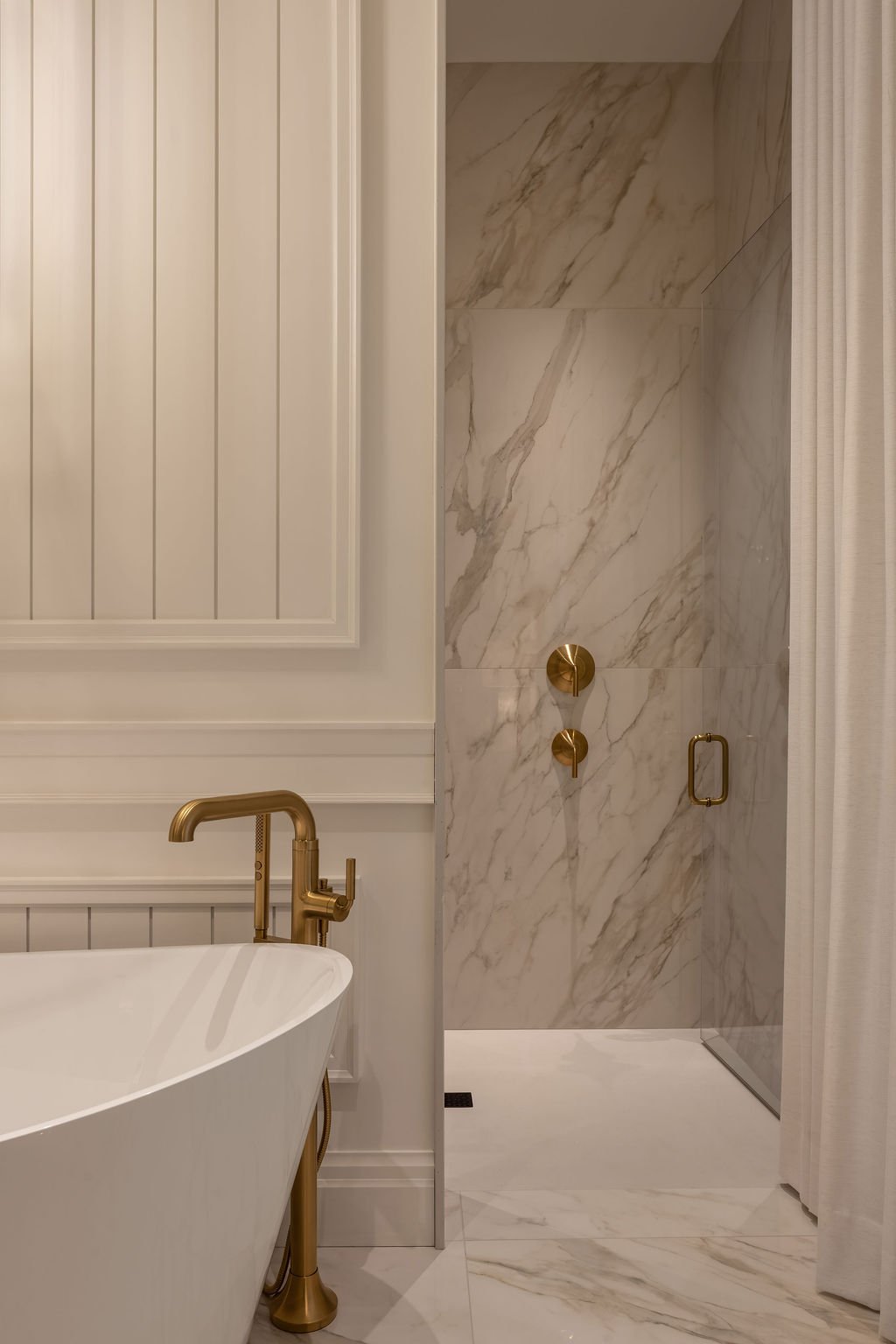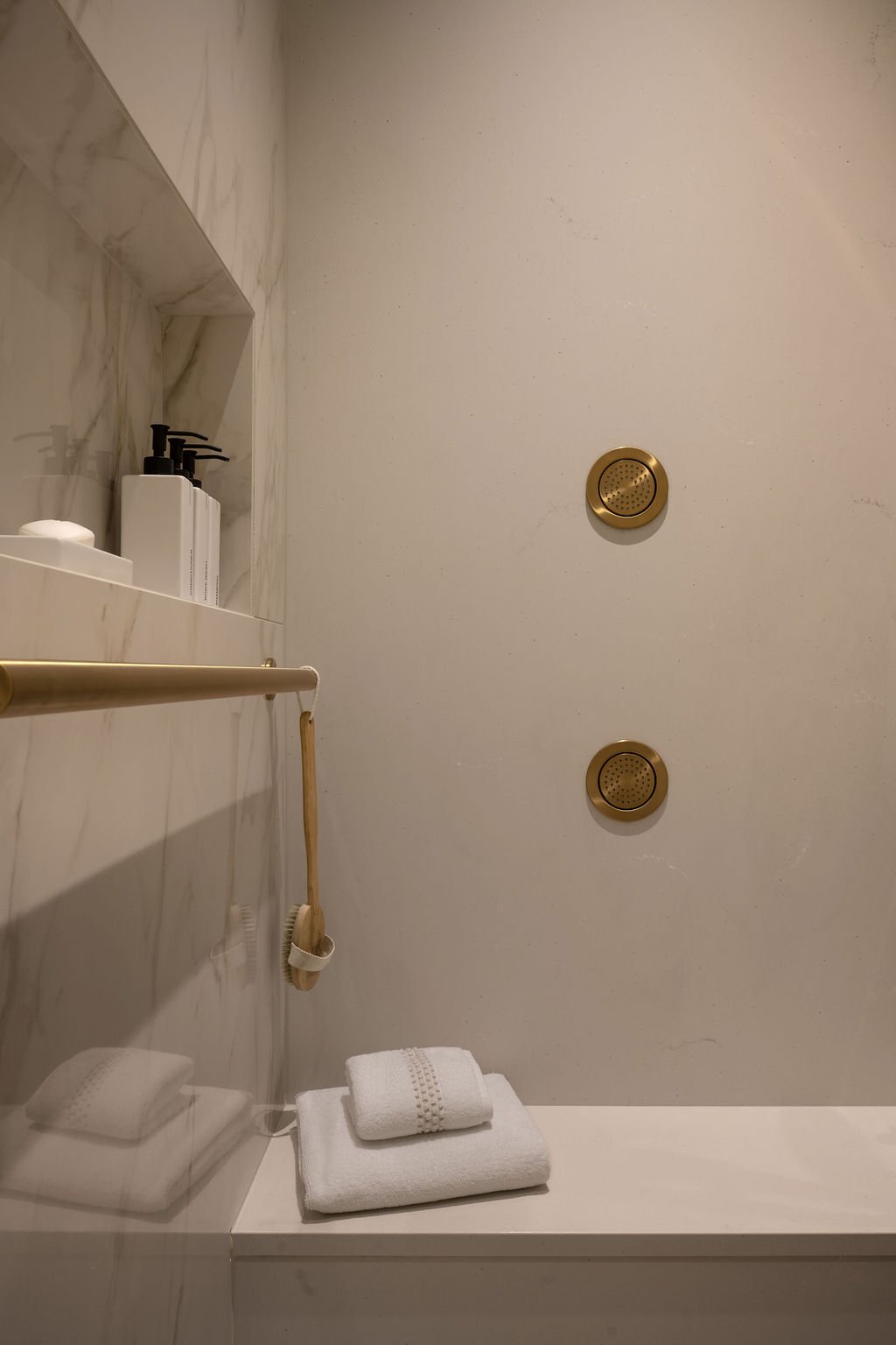 Dans cette salle de bain, ce sont les détails qui donnent toute sa richesse à l’espace. Les coupes de tuile à 45 degrés dans la douche assurent des lignes nettes et une finition impeccable. Le banc intégré invite à la détente tout en ajoutant une dimension fonctionnelle essentielle. La robinetterie, soigneusement assortie, crée une continuité visuelle élégante, tandis que la mouluration apporte une touche de caractère et de raffinement.