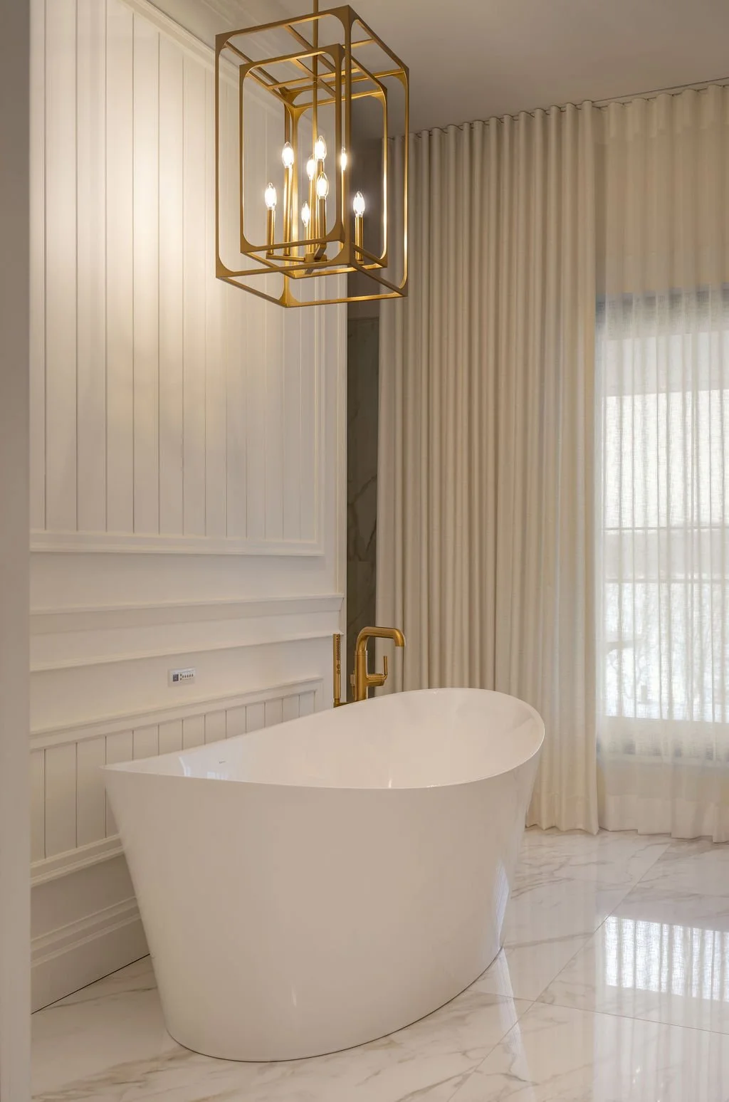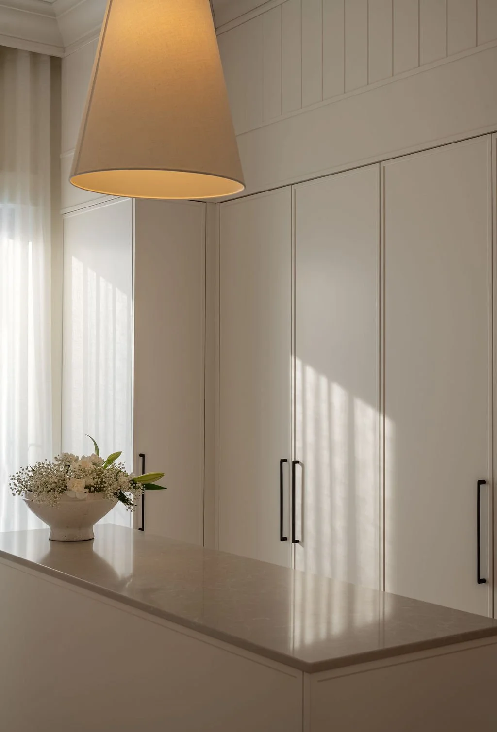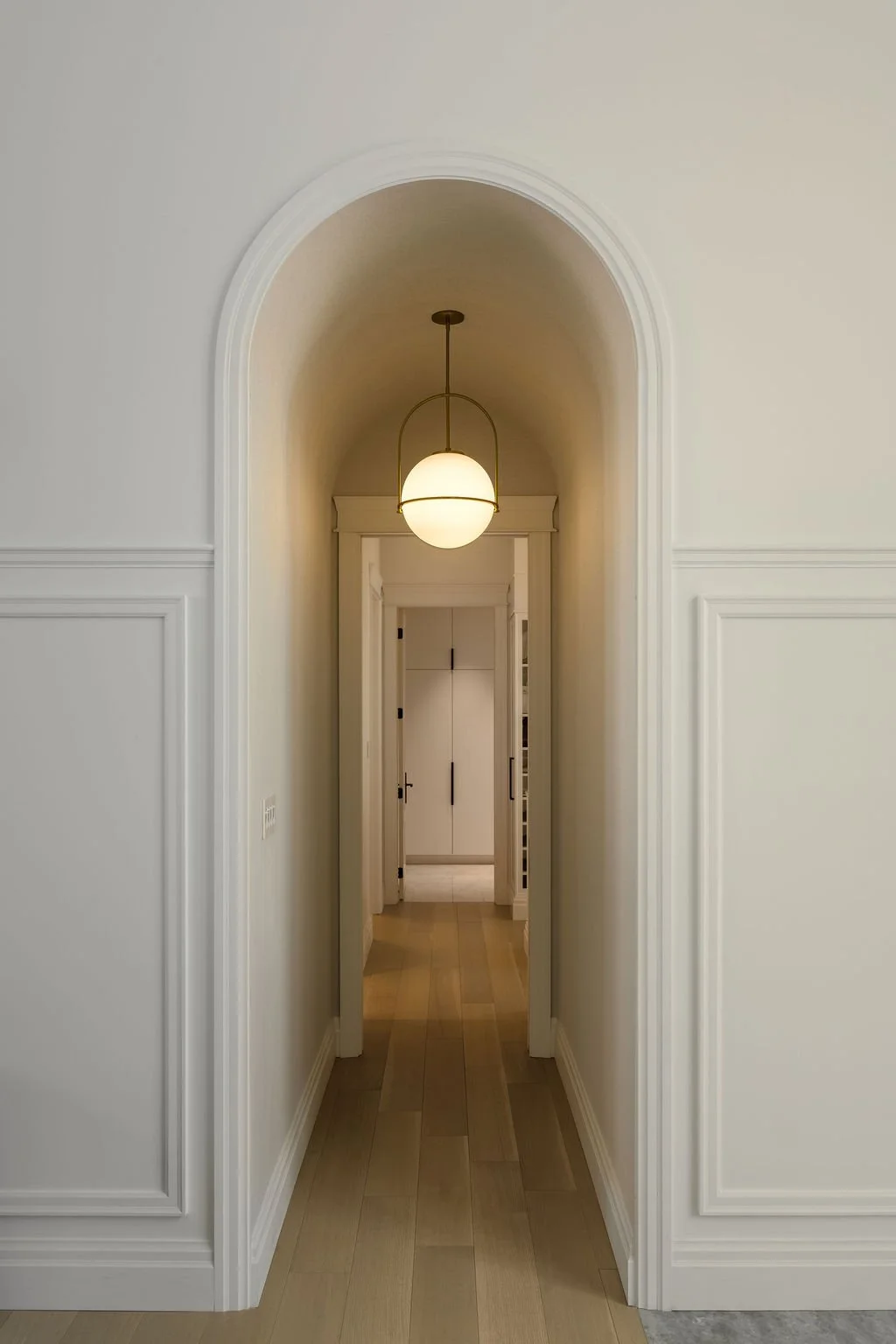 Dès les premiers pas, la maison dévoile son caractère. Cette perspective, marquée par l’arche délicatement moulurée, structure la circulation tout en créant un moment architectural fort. Les lignes classiques, adoucies par une palette lumineuse et des matériaux naturels, guident le regard avec élégance. L’éclairage suspendu vient souligner la hauteur et la profondeur du passage, renforçant la sensation de continuité et d’équilibre.