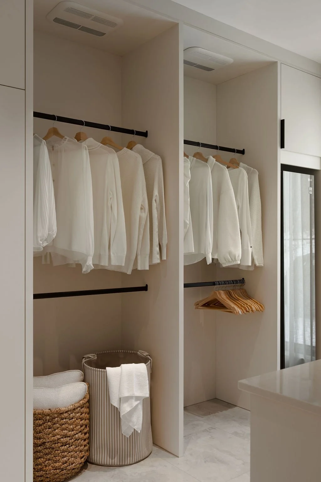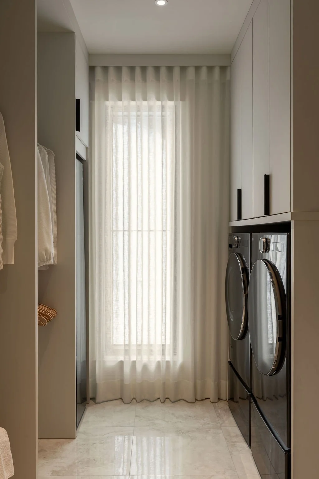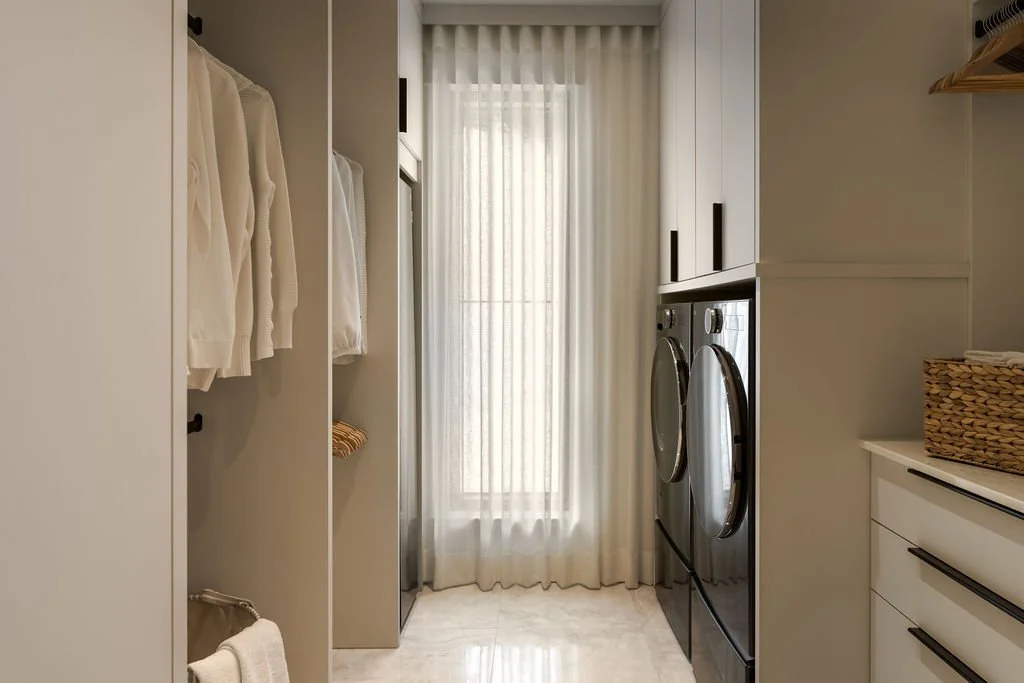 Pensée pour simplifier le quotidien, la salle de lavage mise sur une organisation efficace et un rangement généreux. Les espaces pour accrocher le linge ont été intégrés avec soin afin de maximiser la fonctionnalité sans alourdir l’espace. Chaque élément s’inscrit dans la continuité des lieux, tant par les matériaux que par les lignes, créant un environnement cohérent, pratique et visuellement apaisant. Un espace utilitaire traité avec la même attention que le reste de la maison.